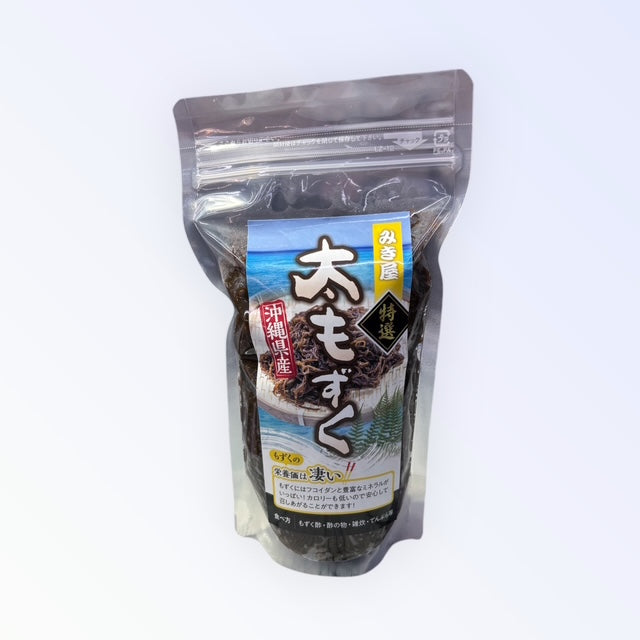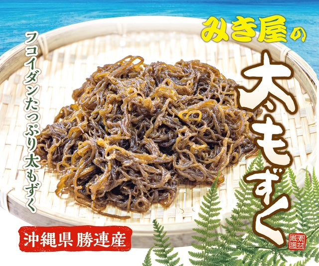 沖縄の海で育った養殖塩もずく!太くて長くしっかりとした歯ごたえが特徴です。独特のぬめりや、コリコリ、シャキシャキしたもずく、日本で消費されているもずくの95%が沖縄産。9割が養殖と三倍酢でも!お味噌汁サラダや、なべ料理にもぴったり。ヌルヌル成分のフコイダンたっぷり、食物繊維、ミネラルを含む健康食品、化粧品などにも利用されております。